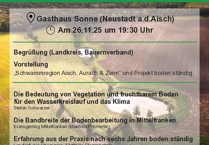 Veranstaltung zum Thema: Landbewirtschaftung als Lösung: WASSER, BODEN, ZUKUNFT am 26.11.2025 im Gasthaus Sonne in Neustadt a. d. Aisch.