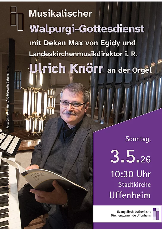Freuen Sie sich auf Orgelmusik in höchster Perfektion von Landesmusikdirektor i. R. Ulrich Knörr bei musikalischen Gottesdienst zu Walpurgi mit Dekan Max von Egidy in der Stadtkirche Uffenheim.